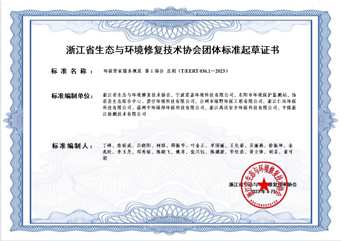 浙江省生態與環境修復技術協會環保管家團體起草證書
